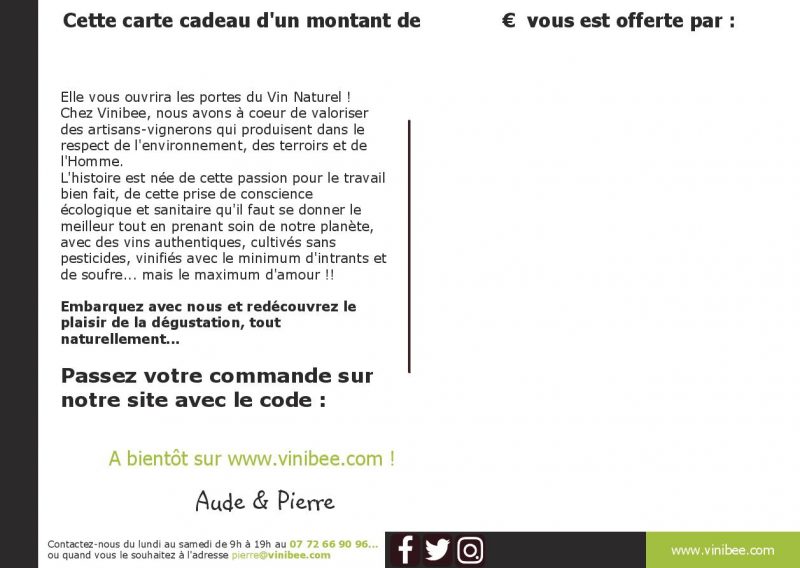 Nous vous enverrons par courrier la carte cadeau sur laquelle figurera un code grâce auquel l’heureux bénéficiaire aura un crédit de 100€ sur tous les vins bio et naturels, coffrets et abonnements box du site 😉