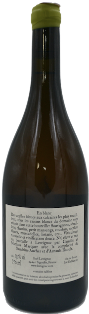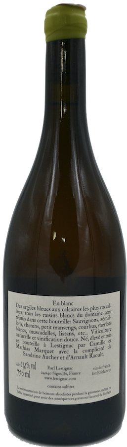 Cette cuvรฉe est produite ร partir d’un assemblage de tous les cรฉpages blancs du domaine, implantรฉs sur des terroirs d’argile bleue et de calcaire. : Sรฉmillon, Sauvignon, Chenin, Petit Manseng, Courbu, Merlot blanc, Muscadelle.