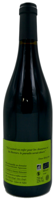 Aprรจs des vendanges manuelles, la vinification se fait en macรฉration carbonique, la fermentation grรขce aux levures indigรจnes et l’รฉlevage se dรฉroule en cuves. La mise en bouteilles se fait sans collage ni filtrage et sans aucun ajout de soufre.