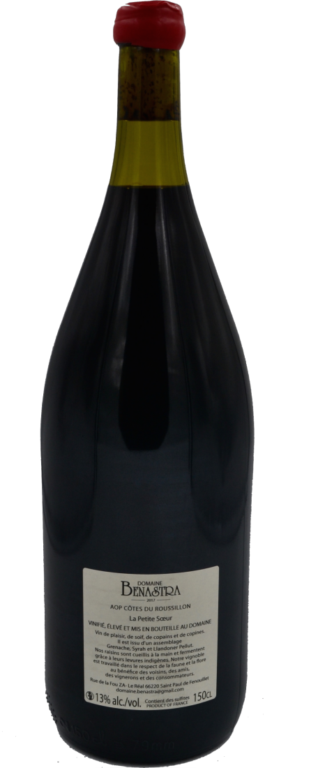 La Petite Soeur est une cuvée sur le fruit, à base de Lledoner Pelut en majorité, Carignan, Syrah, Grenache en assemblage de différentes parcelles, toutes sur sol calcaire métamorphique. La robe rouge est rubis violacée, le nez sur la réglisse et les fruits rouges.
