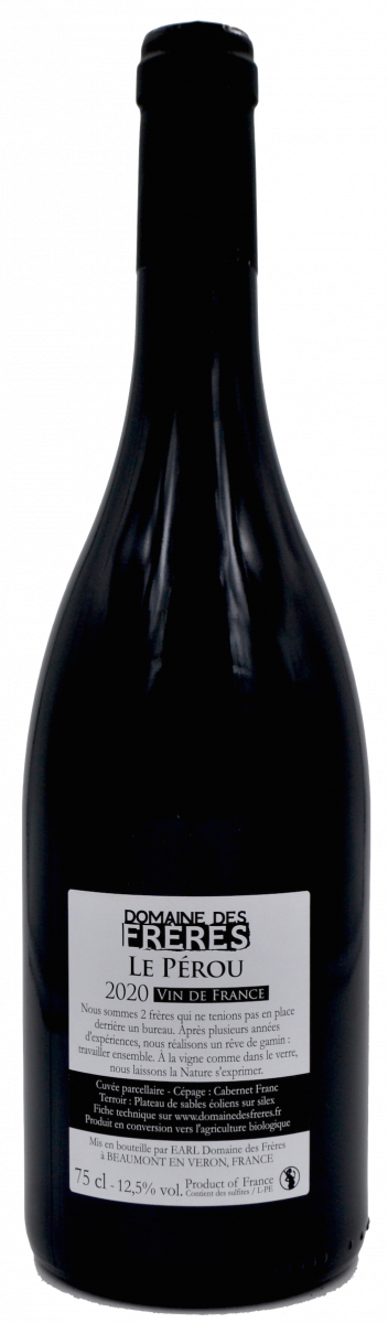 Le Pérou est le nom du lieu-dit où se situe la parcelle d’environ 2 hectares de Cabernet Franc. Elle tient sa spécificité de son environnement, classé Natura 2000, où la faune et la flore font penser à une enclave méditerranéenne avec ses pins maritimes, son thym serpolet et ses cigales. Les vignes sont entourées de bois et sont implantées sur un terroir composé en surface d’alluvions et de sables éolisés avec en dessous un sous-sol de calcaire et de silex . La vinification démarre par un égrappage, avant une infusion d’une dizaine de jours. L’élevage se déroule en cuve et la mise en bouteille se fait sans collage préalable, avec uniquement 20mg par litre de soufre.