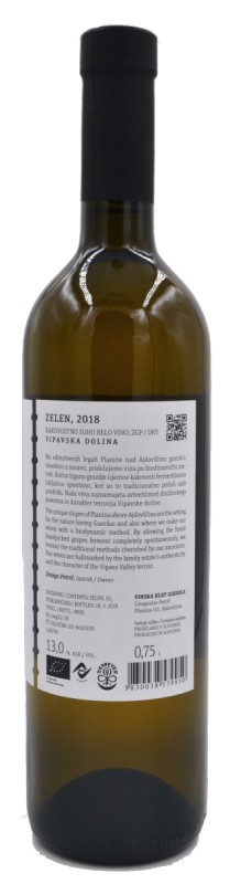 Le Zelen est un des plus anciens cépages autochtones slovènes. Son faible rendement a bien failli le voir disparaître totalement : après la deuxième guerre mondiale, il n’en restait plus que 1,7 ha ! On le trouve dans la haute vallée dans la vallée de Vipavska Dolina , plus communément nommée Vipava, au sud-ouest du pays. La rivière éponyme coule dans cet étroit passage entre le Frioul et la Slovénie centrale.