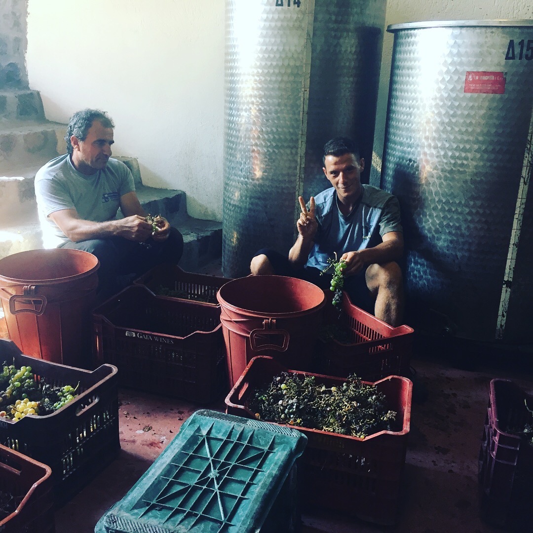 Nous sommes arrivés le 16 août 2017 au domaine, 5 jours après le décès du vigneron Haridimos Hatzidakis (de façon soudaine et tragique). Les récoltes d’août à Santorin ne seront plus les mêmes, mais nous laissons son visage sur Vinibee, en hommage à sa mémoire, à l’homme et à ses nombreuses contributions à la vinification de Santorin. Mais la vie continue, alors que ses enfants apprennent maintenant à suivre ses traces. Haridimos atzidakis a souvent fait œuvre de pionnier, à Santorin… Il a vinifié des cépages rares tels que le Mavrotragano et le Voudomato ; l’utilisation de levures indigènes est devenue la règle et non plus l’exception ; il a présenté des vins issus de vignobles uniques, en utilisant des raisins certifiés biologiques (les siens) et plus encore.
