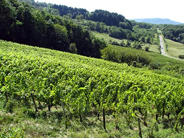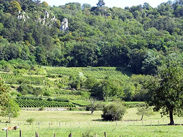 โ en haut du coteau, les Chardonnay et les Savagnin en sols argilo-calcaire sur le socle calcaire,