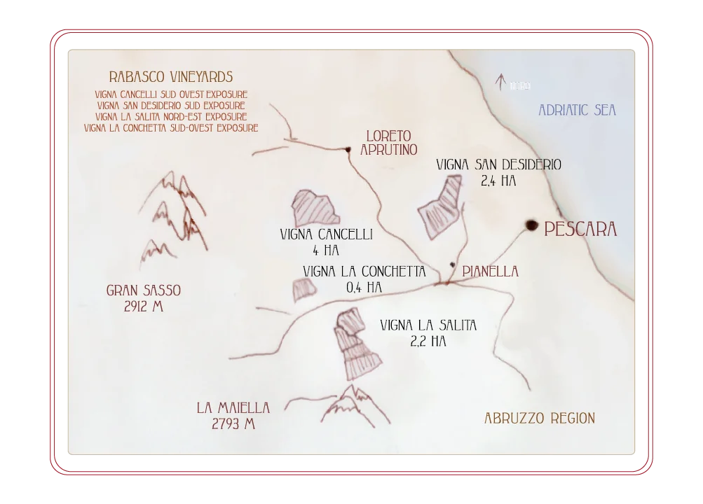 Le vignoble du domaine est nichรฉ dans lesย collines, entre les hautes montagnes des Abruzzes, la Majella, la Montagne Mรจre et le Gran Sasso, et au loin la mer Adriatique, ร  environ 40 kilomรจtres. La fraรฎcheur et la salinitรฉ d’un cรดtรฉ, la minรฉralitรฉ de l’autre.